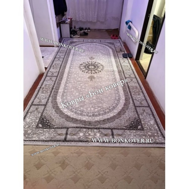Долго выбирала, остановилась на данной модели. Ковер понравился, очень красивый праздничный, нежной расцветки сливочно кремовой. Ковёр средний плотности, к этому я была готова, т. к. вес ковра 9 кг, ковры аналогичных размеров более плотной набивки весят 12 кг. Слегка хамелионит, в дневное время цвет..
