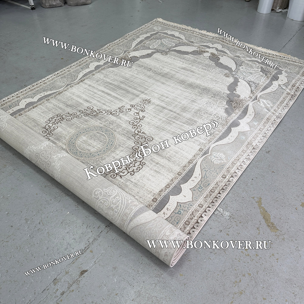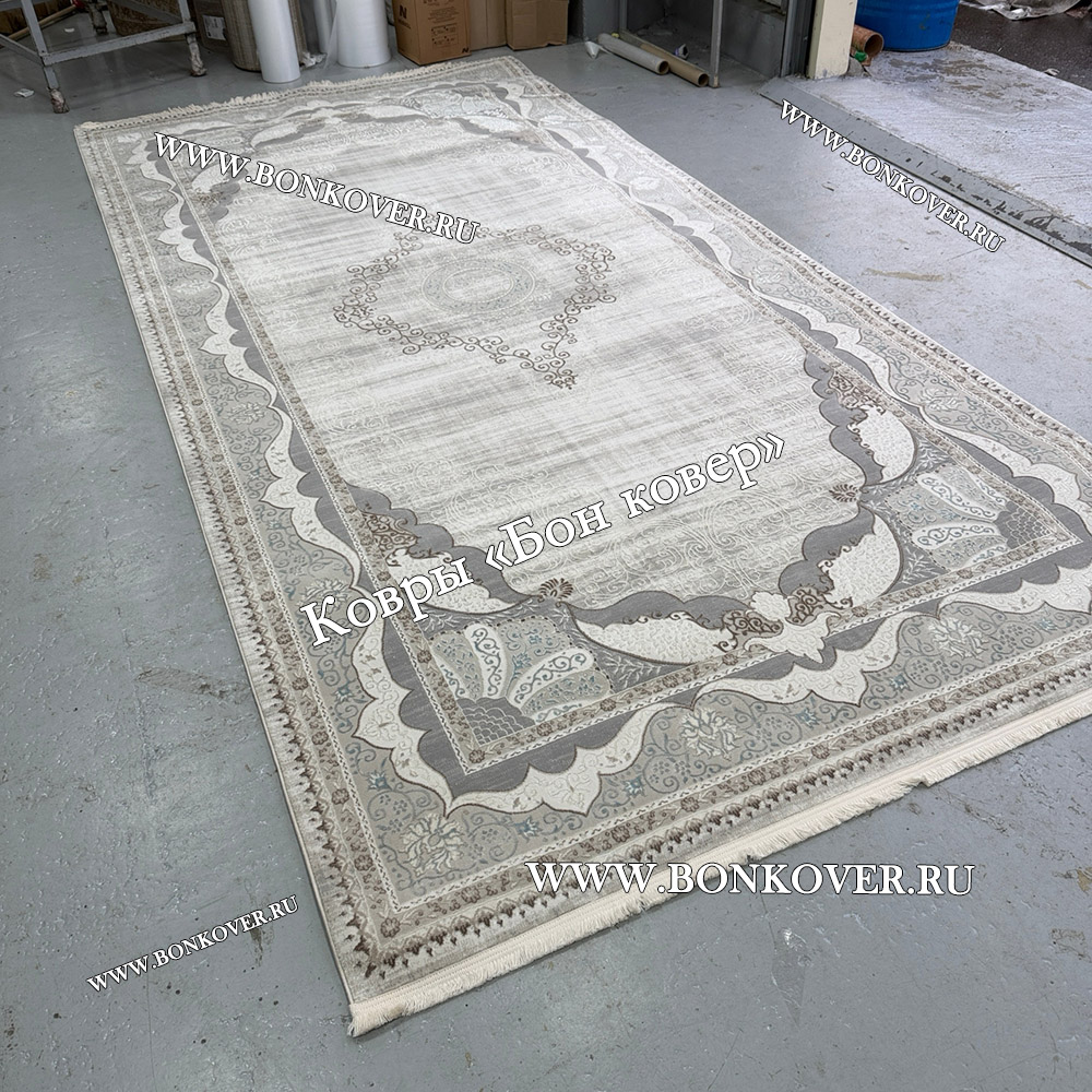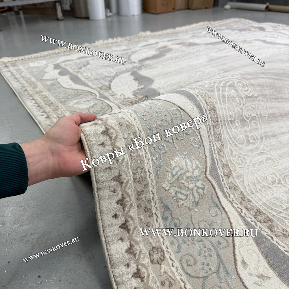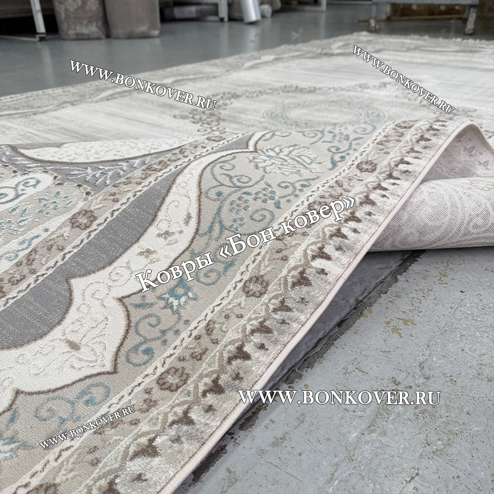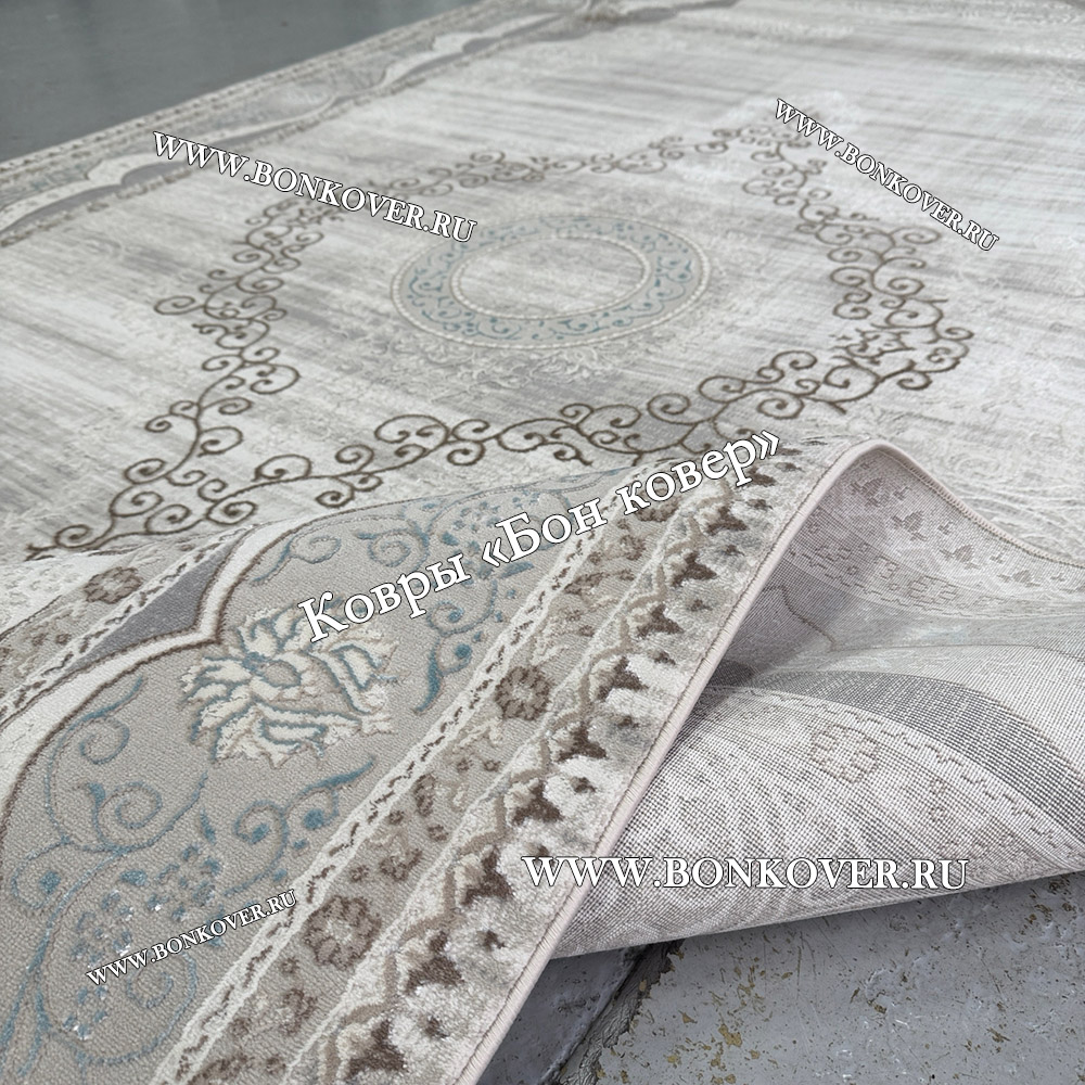 Отличный ковёр, качественный и очень приятно ножкам по нему ходить, без заломов, цвет бежево-серый с оттенком пыльно голубого